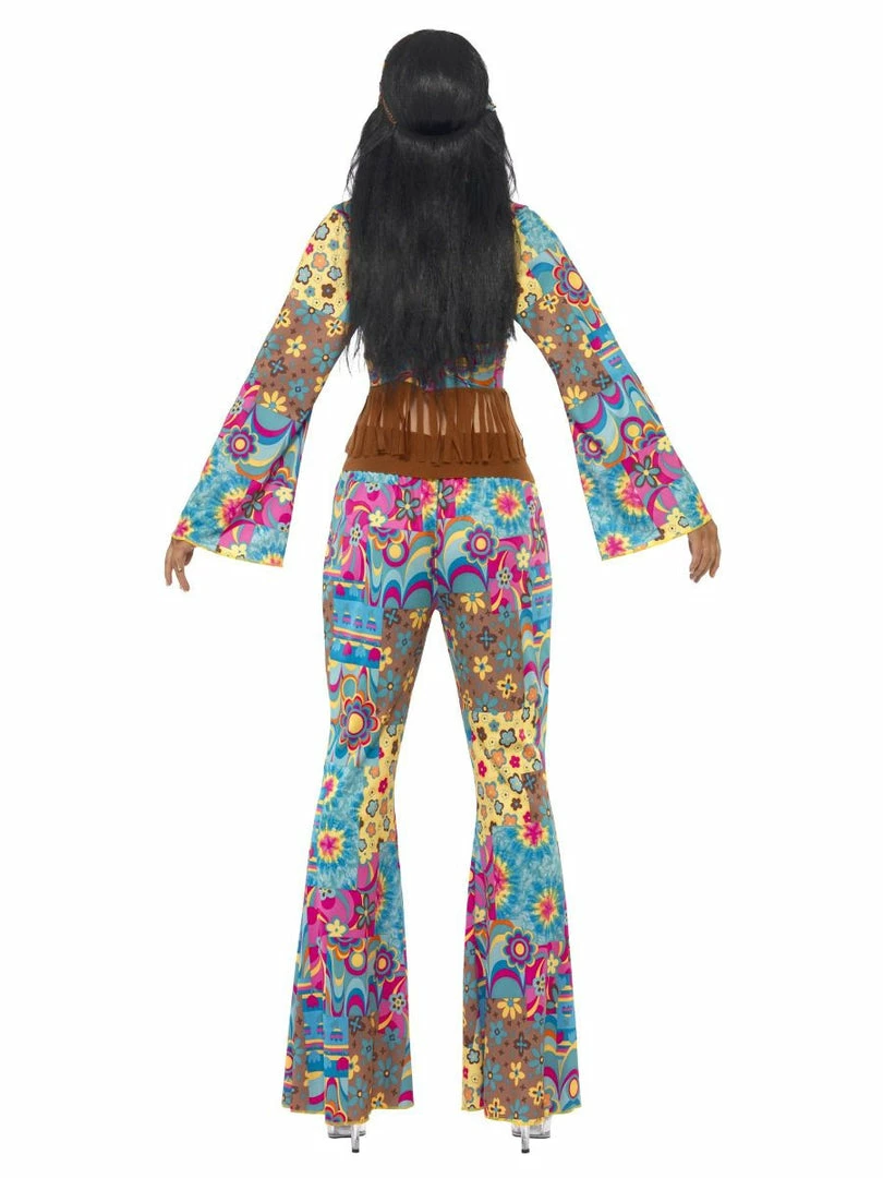 This 60’s floral hippie outfit features a colourful crop top with flared sleeves and a tassel trimming as well as matching flared trousers and a headband for a total hippy look.