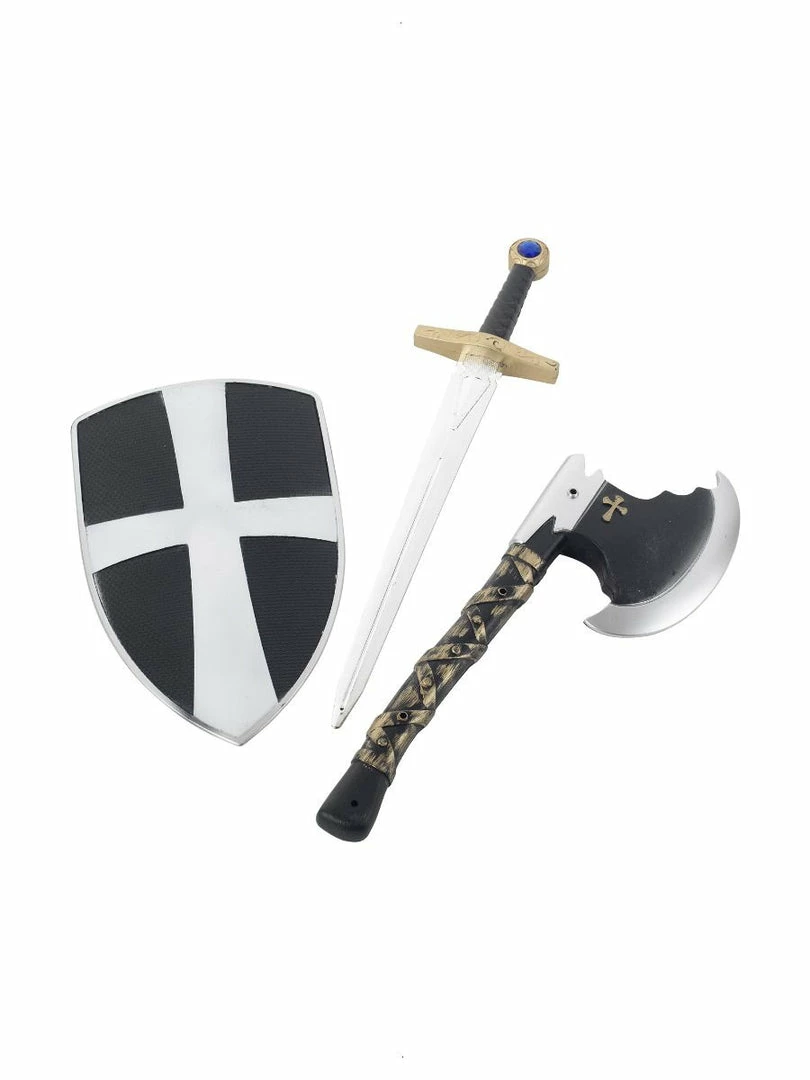The set includes a black shield with white cross, a sword with jeweled hilt and medieval axe.