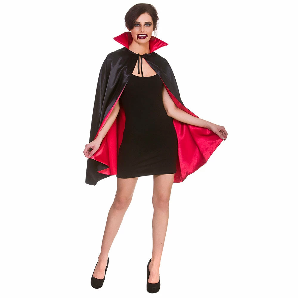 This gorgeous ankle length black Deluxe Satin Vampire Cape 80cm with red lining and ties to the neckline.