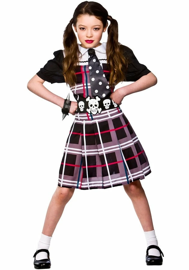 This Freaky Schoolgirl children’s Halloween fancy dress costume includes patterned dress with attached tie and belt. Just add some striking lipstick to complete the look!