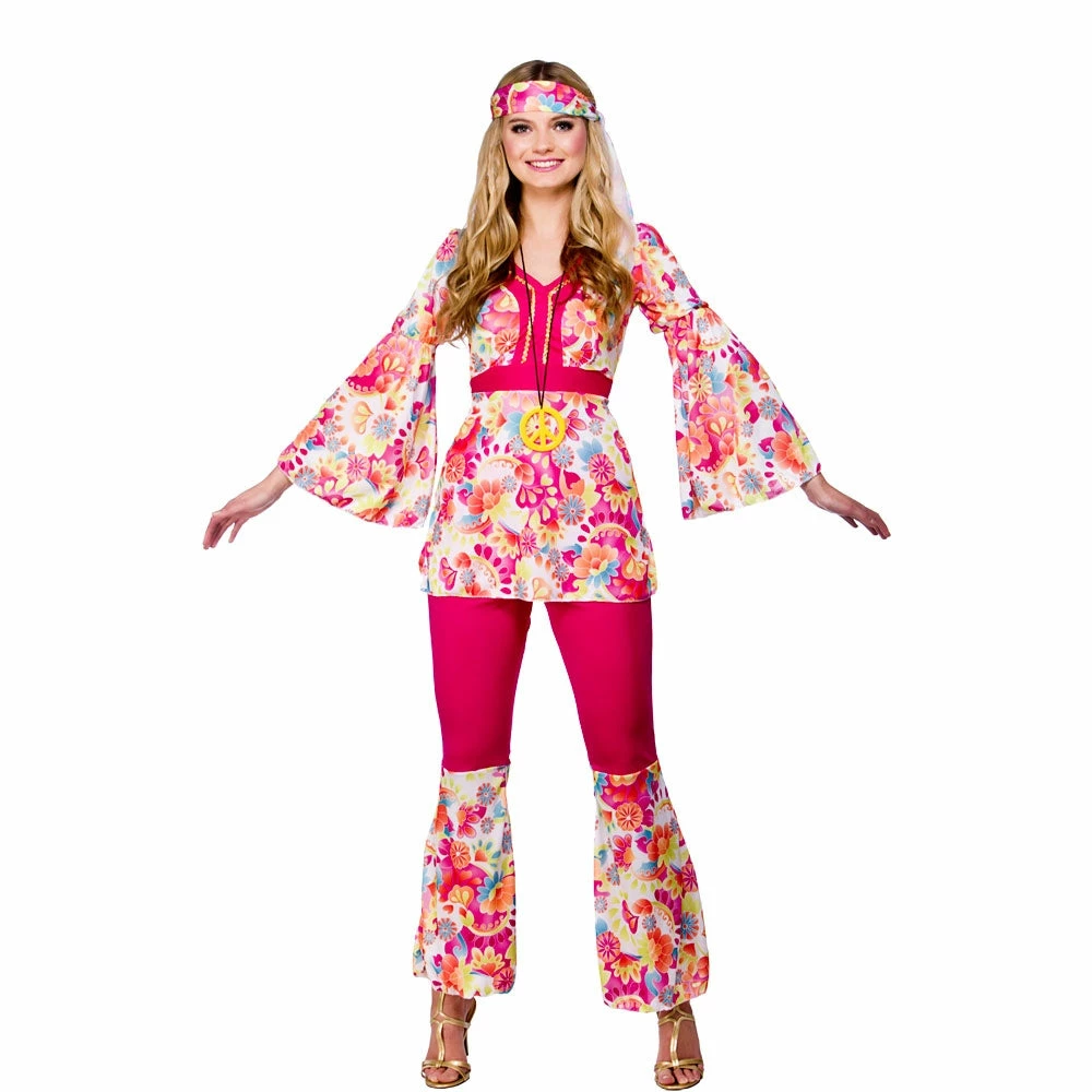 The chic costume comprises of a long draping top decorated in a psychedelic paisley print to the upper half and tye dye print to the lower, a pair of bright pink flared trousers with paisley print to the bottoms. Completing the costume are the all important accessories for any Lady looking to re create the classic summer of love look: a bright pink belt with white flower buckle and a paisley print hairband.