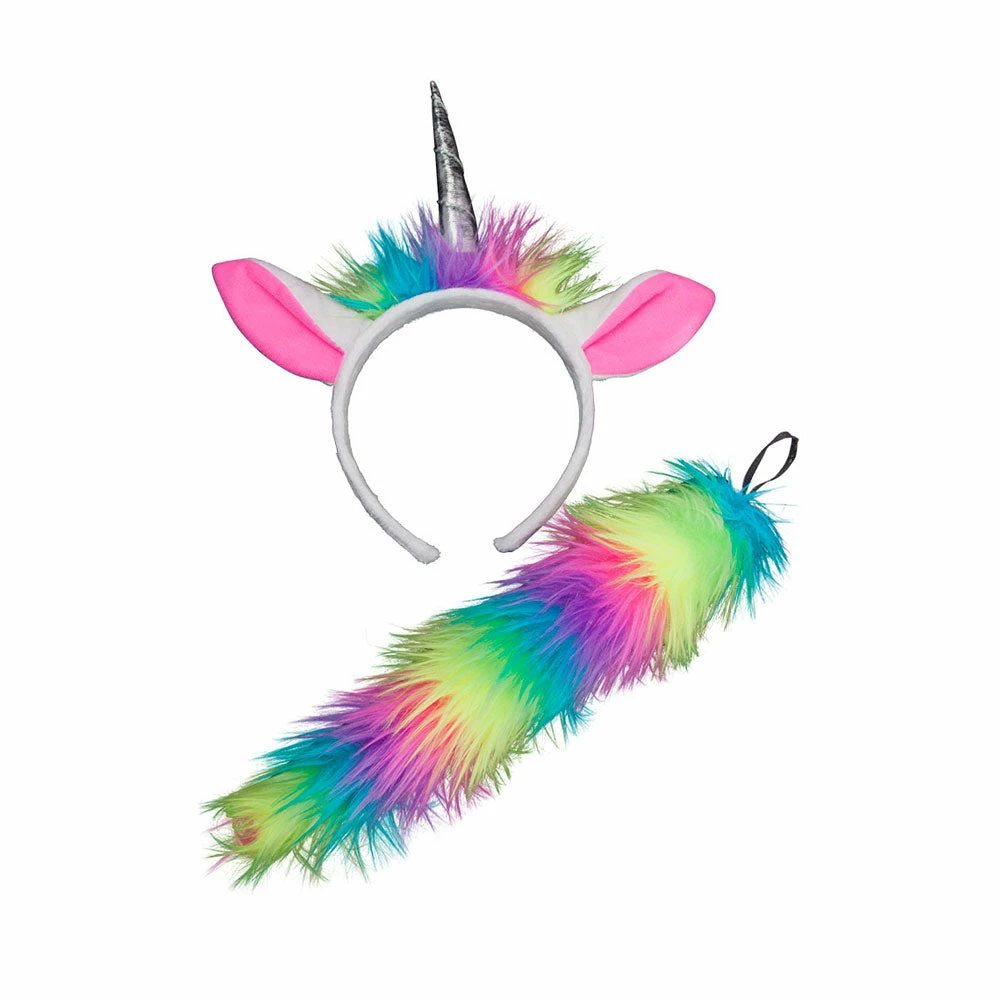 Set contains unicorn tail and headband with ears and horn.