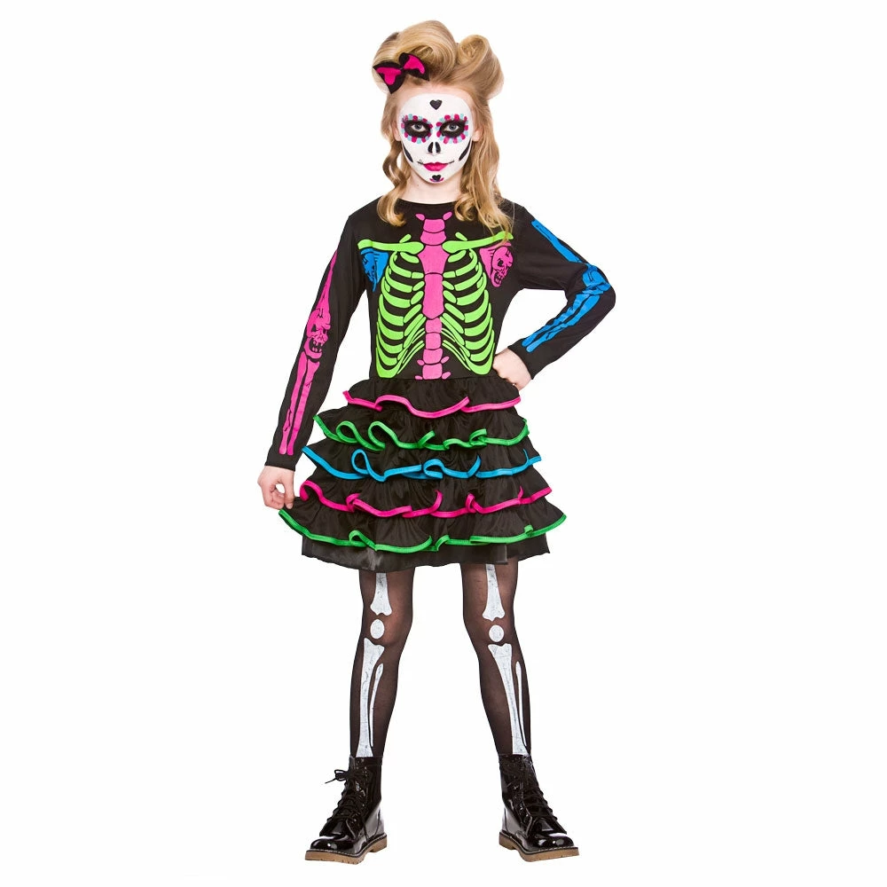This Sweet Skully Chick kids Day of the dead outfit outfit includes neon dress with bone skeleton print and bone hair clip. Complete your look with some of our Facepaints