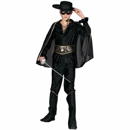 He’ll become Zorro, the famous cunning character created in 1919, once he puts on the all black outfit, which includes the jumpsuit with a black belt decorated in white designs and a centre star, bandana, cape, hat, and finally the mask to hide his true identity from his opponents. View our accessories to pick out the perfect sword to complete his look. Mark a Z like the infamous swordsman and move swiftly like a fox in this fancy dress for his next Masquerade, Heroes, or Film themed party. Shirt Trousers Belt Hat