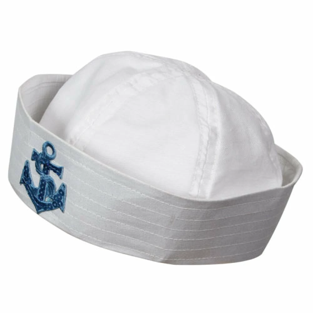 Land ho, anchors away! Complete a range of ladies sexy sailor or men’s sailor fancy dress with our Adults Sailor Doughboy Hat. The hat is made from stiff white cotton and shaped like a traditional sailor cap and is decorated with an embroidered blue anchor to the front. A great nautical fancy dress accessory to wear at a navy or movie themed fancy dress party. Includes White Sailor Hat with blue anchor