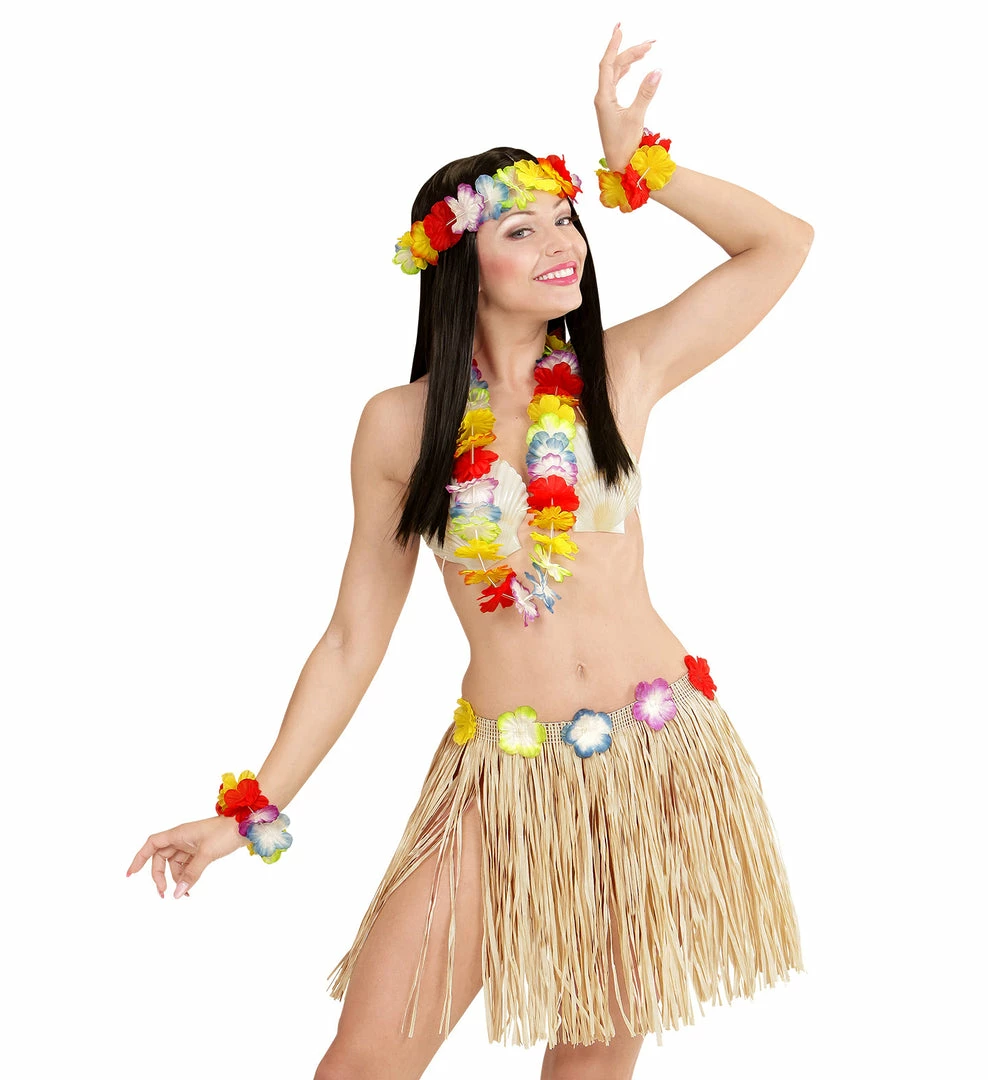 Look like you have just stepped off the beach in this sexy Hawaiian Party Hawaiian fancy dress set. Includes is an elasticated skirt, flower headpiece, matching cuffs and lei . Ideal for those summer beach parties or one with a Hawaiian costume theme Includes Hula Skirt, flower crown, wrist cuffs and lei
