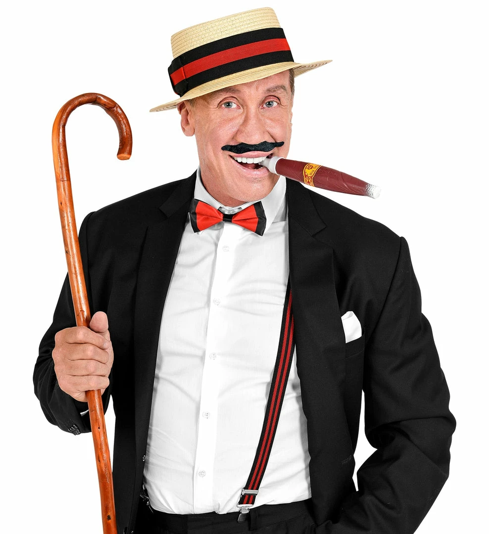 This includes a lovely light coloured straw boater with a traditional wide red and black hatband. The braces are adjustable braces for use with trousers. They have elasticated straps and three metal clasps and are extra long up to 115-120 cm. There is a matching bow tie. Fake cigar and moustache complete the desired look.
