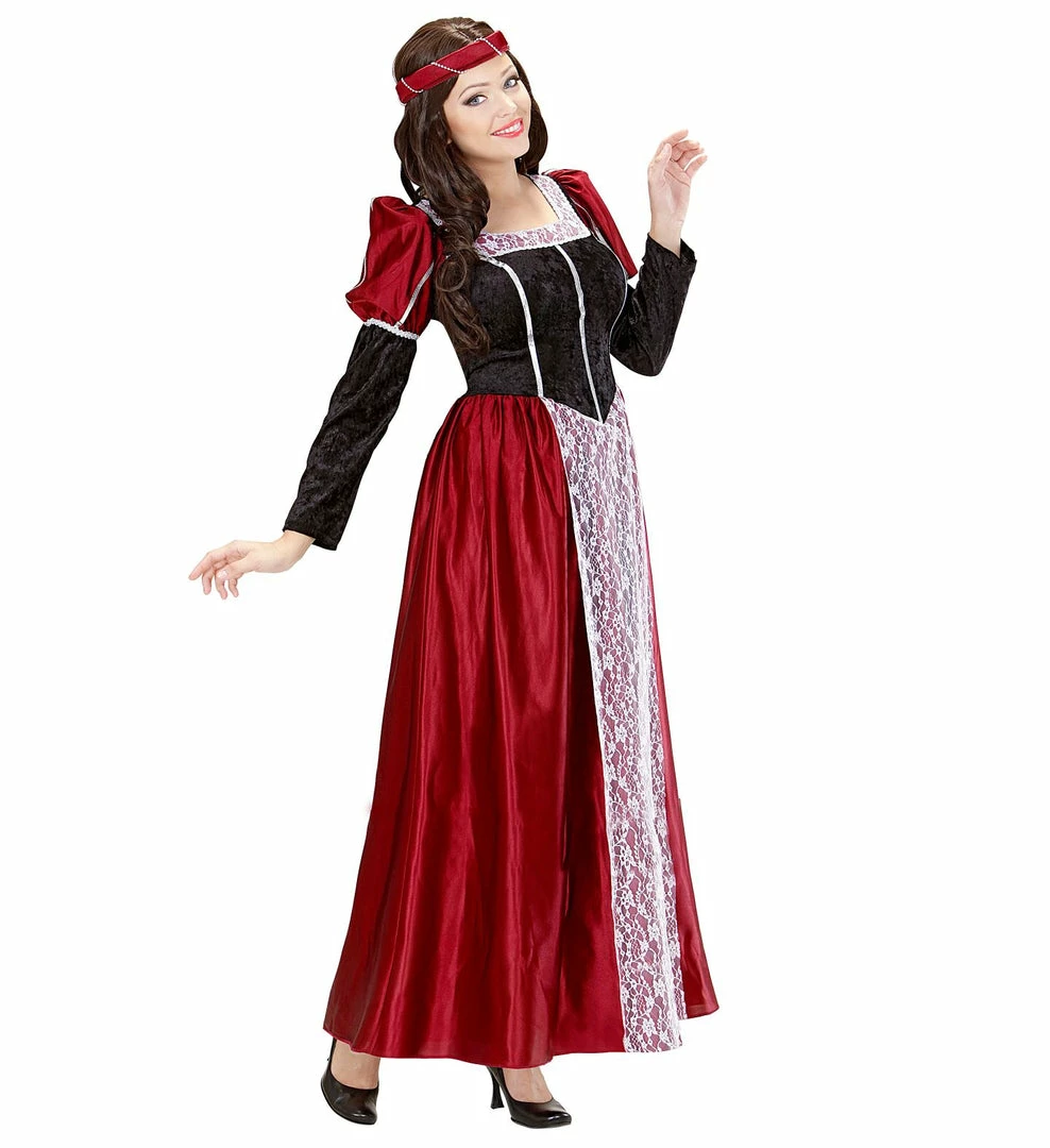 This medieval lady Costume includes a long renaissance style gown with long black sleeves with puffed shoulders and lace around the neckline and dress. A matching headpiece with bead detailing adorns the head to complete the look.