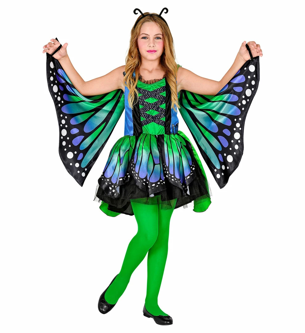This kid’s blue and green butterfly outfit feature a bodice style tutu dress, attachable colourful wings and completing the look is the antennas.