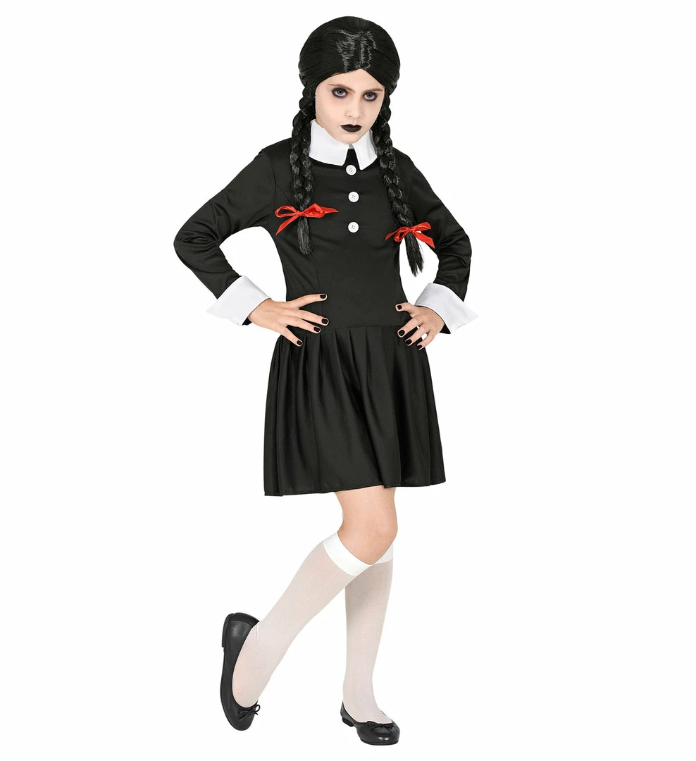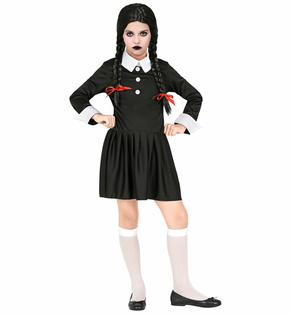 Become the creepiest one of the Addams family in our children’s Dark Girl Wednesday Addams style fancy dress children’s costume.