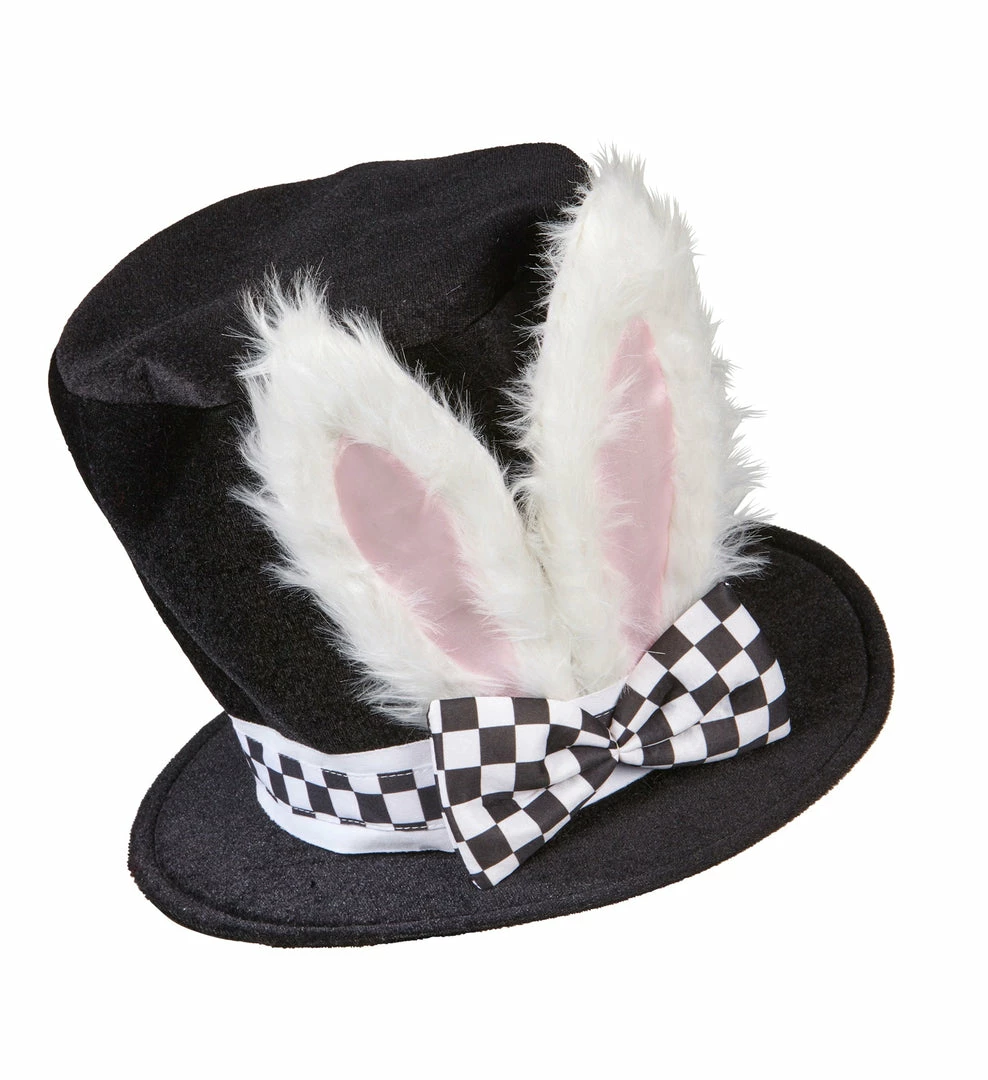 Perfect for any Alice in Wonderland party as the White Rabbit or even a hat party. This cute black top hat with bunny rabbit ears attached to a black and white checkered bow tie. Why not add a pocket watch and facepaints to complete look.