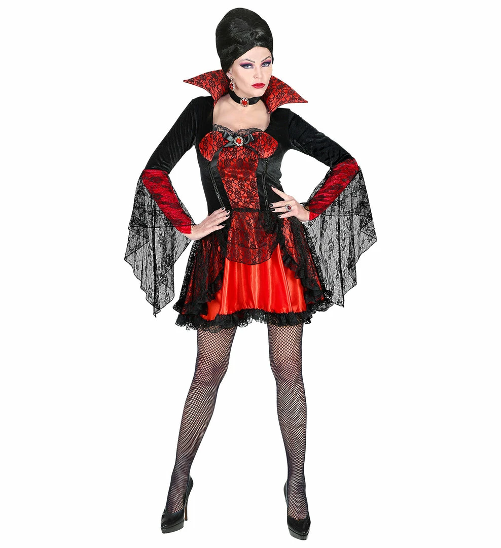 It comprises of a beautiful dress featuring a long sleeved blood red and black dress with long black lace at the arms and around skirt. This beautiful vampire dress also has a tall stand-up collar and is completed with a jet black choker to match gem on dress.