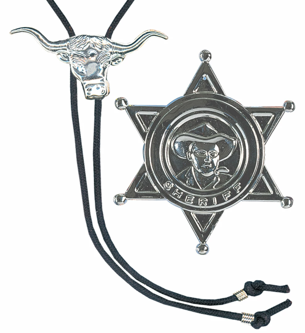 This cowboy set is the perfect accessory for any wild west or western fan. The sheriff’s star is silver-plated and together with the cowboy tie, with bull or steer decoration, it is the perfect costume accessory for a western lawman.